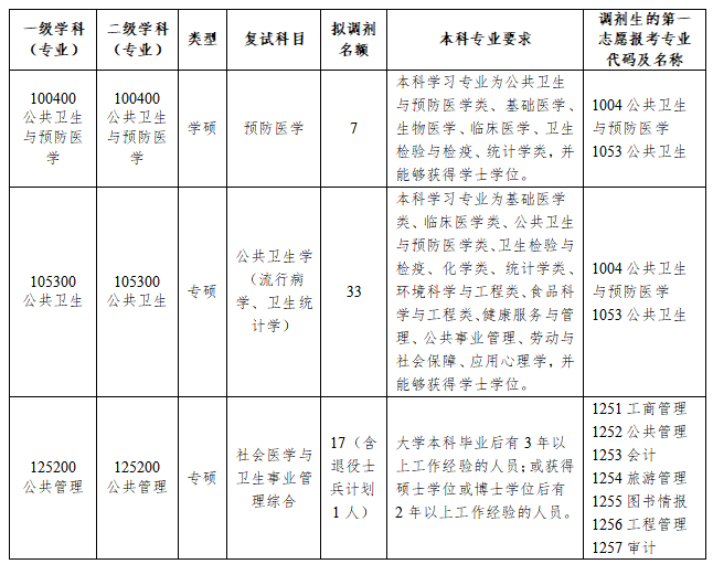 一轮调剂复试时间暂定为4月12日(上午:1004公共卫生与预防医学、1252公共管理;下午:1053公共卫生)。