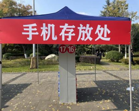 我校考点在成龙校区第一教学楼的A区、B区、C区三个入口及沿路,均设置有手机自助存储柜。请考生将不得携带进入考场的物品放置在集中区域,自查无误后有序排队接受安检。