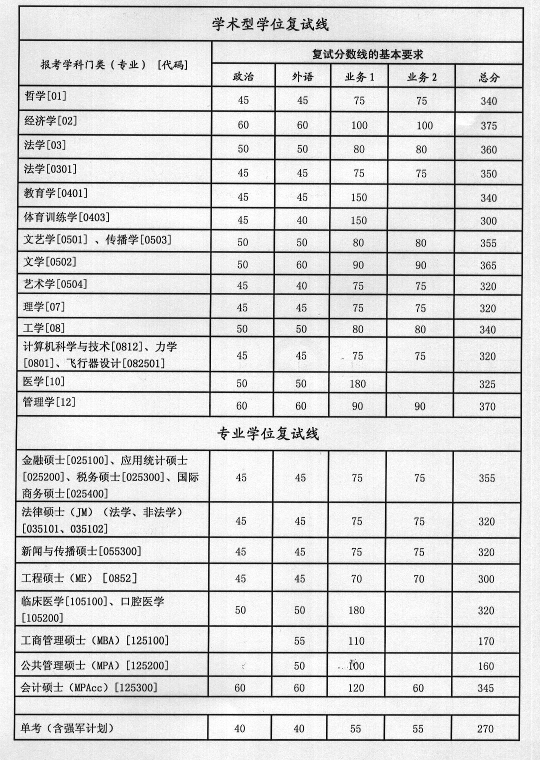 一、此分数线为学校划定的各学科或专业(领域)单科、总分的最低分数线,单科、总分须同时满足要求。考生能否进入复试,还须达到各学院按差额复试比例规定的各项单科和总成绩要求,请考生们咨询或查看报考学院网页公布的实际复试分数线。
