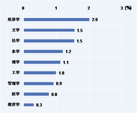 3. 调查显示,从2010年9月26日到12月24日,1.1%的被调查的2011届本科毕业生计划毕业后出国留学。在调查覆盖的专业大类中,有留学计划的本科毕业生中比例最高的为经济学(2.0%),其次为文学(1.5%)和法学(1.5%)。
