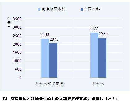 京津地区2009届本科毕业生找工作时月收入期待底线为2330元,高于全国2009届本科生这一指标(2073元)257元;其毕业半年后实际月收入达到2677元,高于全国本科毕业生平均月收入(2369元)308元。其中就业的本科毕业生中有41%月收入在2000元以下,有22%月收入在3000元以上。