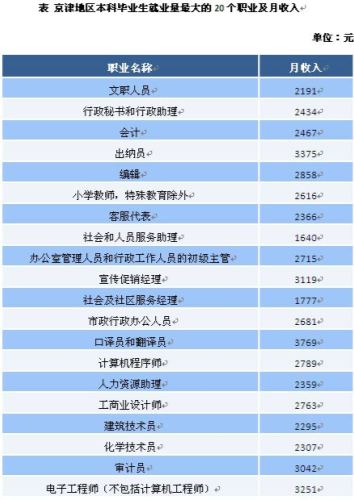 京津地区2009届本科毕业生半年后就业量最大的职业主要是文职人员、行政秘书和行政助理、会计。在就业量最多的前20个职业中,月收入最高的依次为口译员和翻译员(3769元)、出纳员(3375元)、电子工程师(3251元)。就业量最大的行业是各级党政机关、储蓄信用中介、小学和中学教育。在就业量最大的前10个行业中,月收入最高的是储蓄信用中介(3365元)和广播电视业(3279元)。