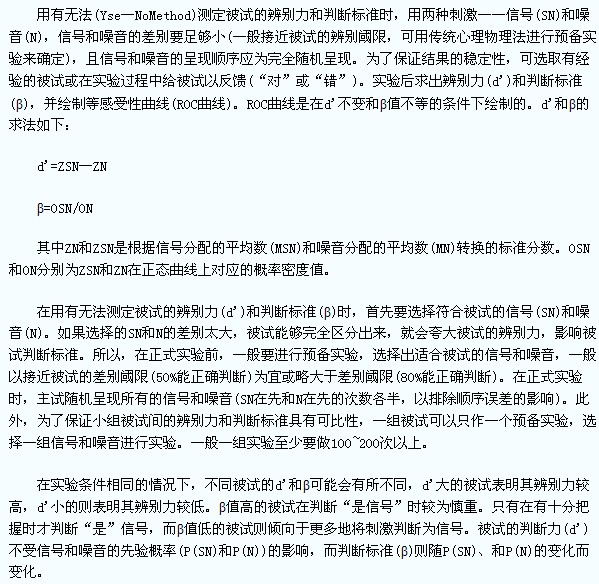 当主试呈现刺激之后,让被试判定所呈现的刺激中有无信号,被试的反应很简单。“有”记为“+”,“无”汇为“-”。