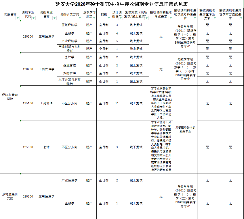 经济与管理学院、乡村发展研究院2026年硕士研究生招生部分学科(专业)接收调剂考生,现根据《延安大学2026年硕士研究生招生接收调剂办法公告》文件精神,在“延安大学经济与管理学院2026年硕士研究生复试工作实施方案”的基础上,就两院调剂相关事项公告如下: